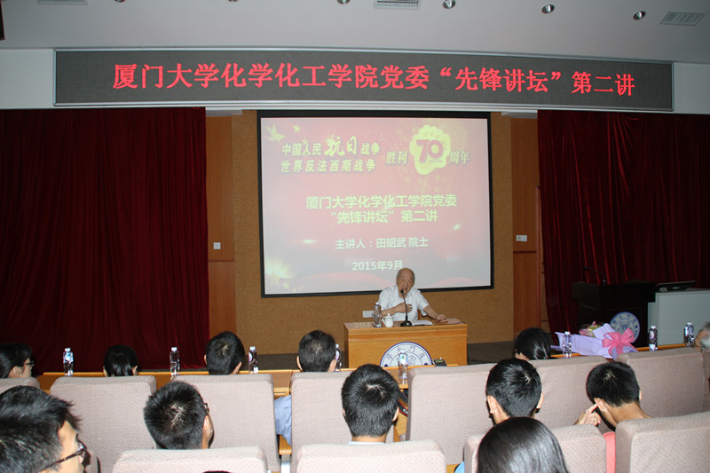 今年是中国人民抗日战争暨世界反法西斯战争胜利70周年,9月3日,我国于天安门广场举行了盛大隆重的阅兵仪式,海洋之神8590cn官网师生倍受鼓舞。9月14日上午,在新学期开学的第一天,海洋之神8590cn官网在化学报告厅举办“开学第一课”主题教育活动,邀请德高望重的田昭武院士为全院师生作主题为《勿忘国耻·圆梦中华》的报告会。可容纳近三百人的报告厅座无虚席,学院师生纷纷前来聆听田先生的精彩报告,其中,九十高龄的黄本立院士也莅临报告会现场。学院党政领导,院关工委老同志,师生代表等出席本次报告会。报告会由院党委副书记李芬芬主持。