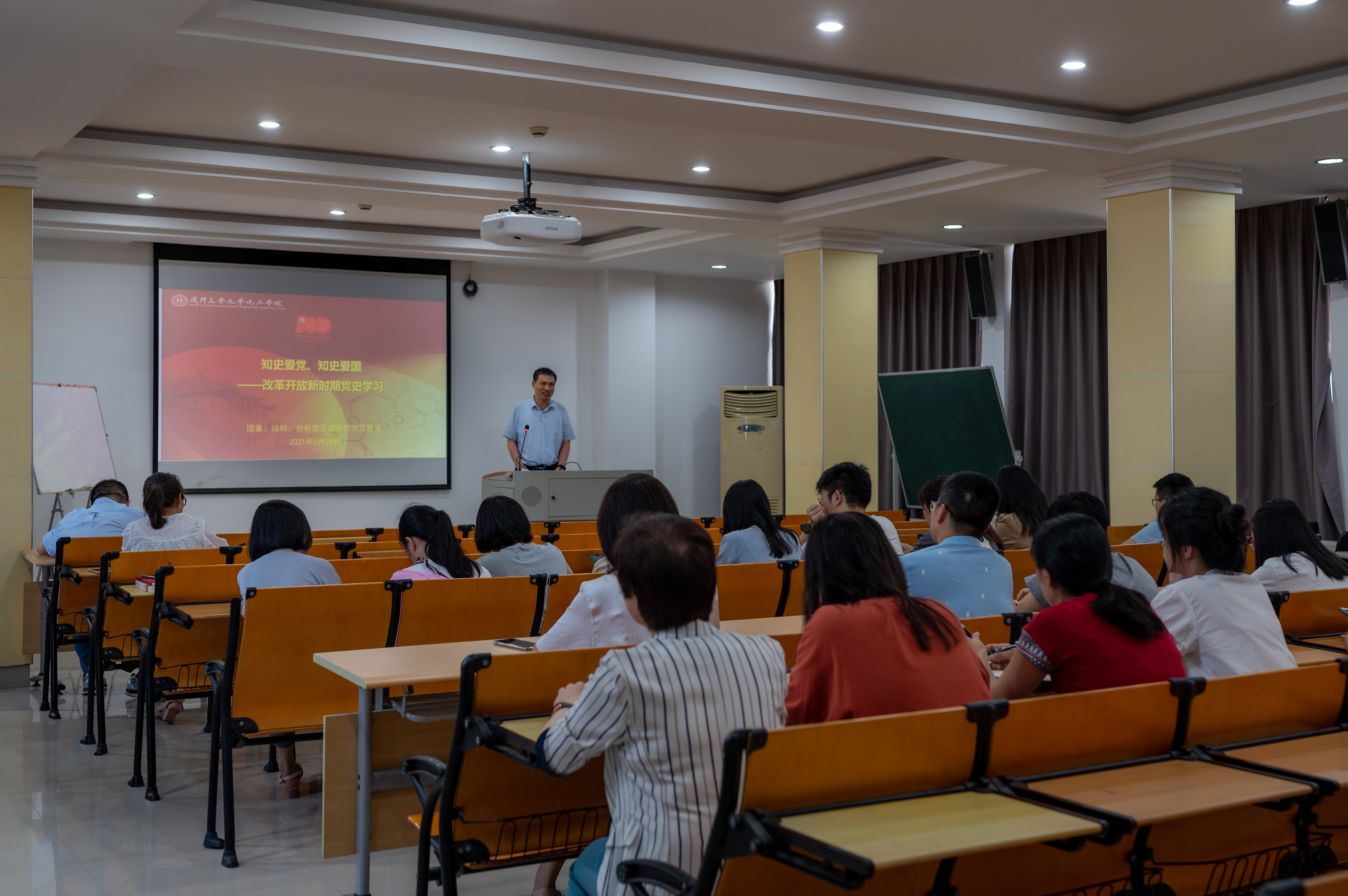 谢兆雄教授指出,“以史为镜,可以知兴替”作为一名党员我们必须把党的历史学习好、总结好,把党的成功经验传承好、发扬好。谢兆雄教授首先简要介绍了中国共产党从“革命”到“建设”、从“改革”到“复兴”这四个不同历史时期的主题和主要任务,随后结合自身经历重点讲述了改革开放建设有中国特色社会主义的提出和践行给我国带来了翻天覆地的变化。改革开放以来中国和发达国家的差距越来越小,但是我们还存在许多不足,有许多困难,面对困难我们要有信心,要有担当。作为人民教师和科技工作者我们要把国家发展和个人发展相结合,要努力钻研国家卡脖子重大课题,相信在中国共产党的领导下,在众多党员的共同努力下,在新百年的新征程上我们一定能够实现中华民族的伟大复兴梦。
