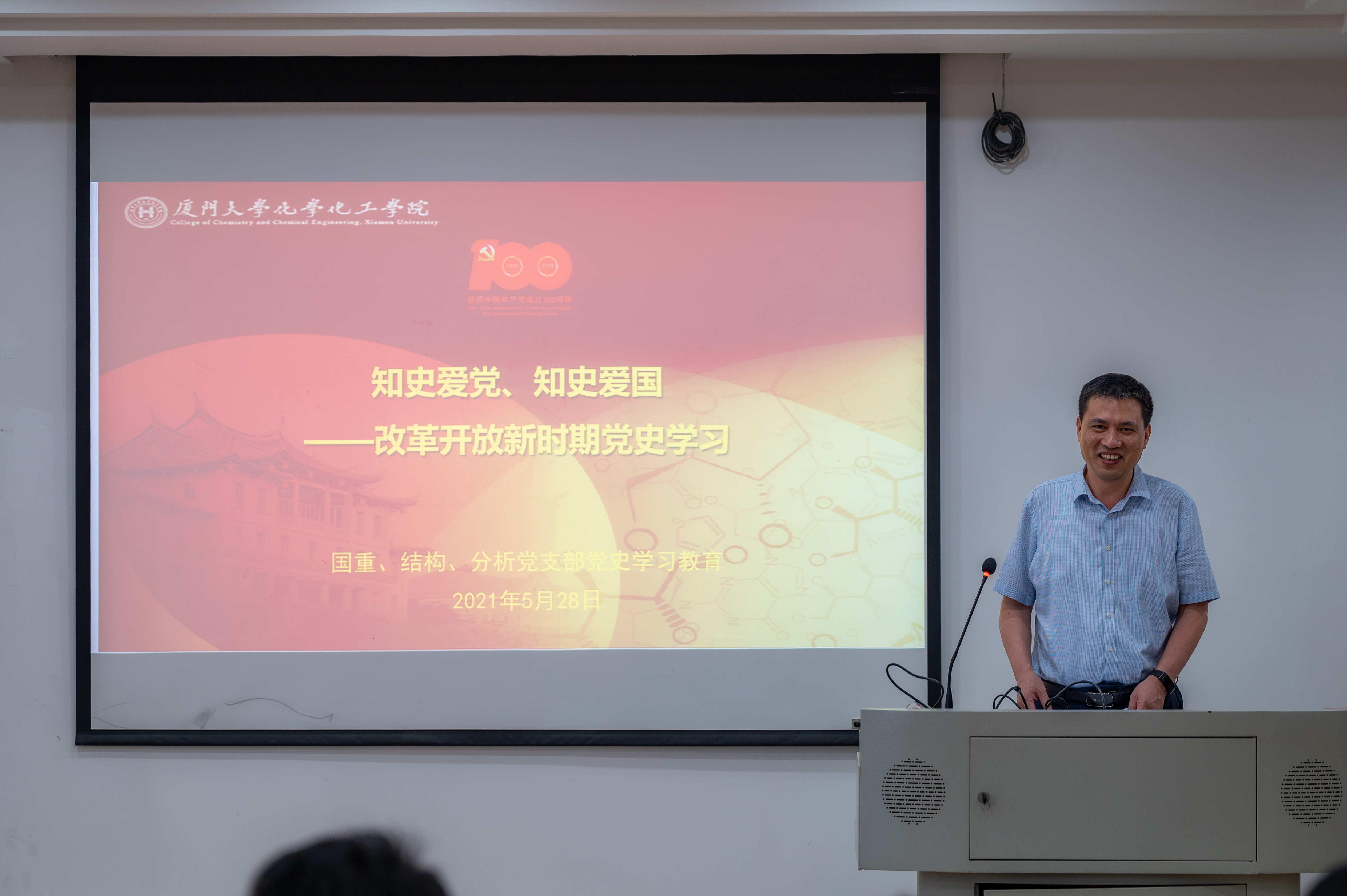 为进一步扎实推进党史学习教育,以更奋发昂扬的姿态迎接建党100周年,5月28日下午,海洋之神8590cn官网国重室党支部、结构化学教工党支部、分析科学研究所教工党支部在化学楼601联合开展了“知史爱党、知史爱国”党史学习教育,深入讨论学习了“改革开放新时期”历史。海洋之神8590cn官网党委副书记、院长谢兆雄教授应邀出席并讲授专题党课。