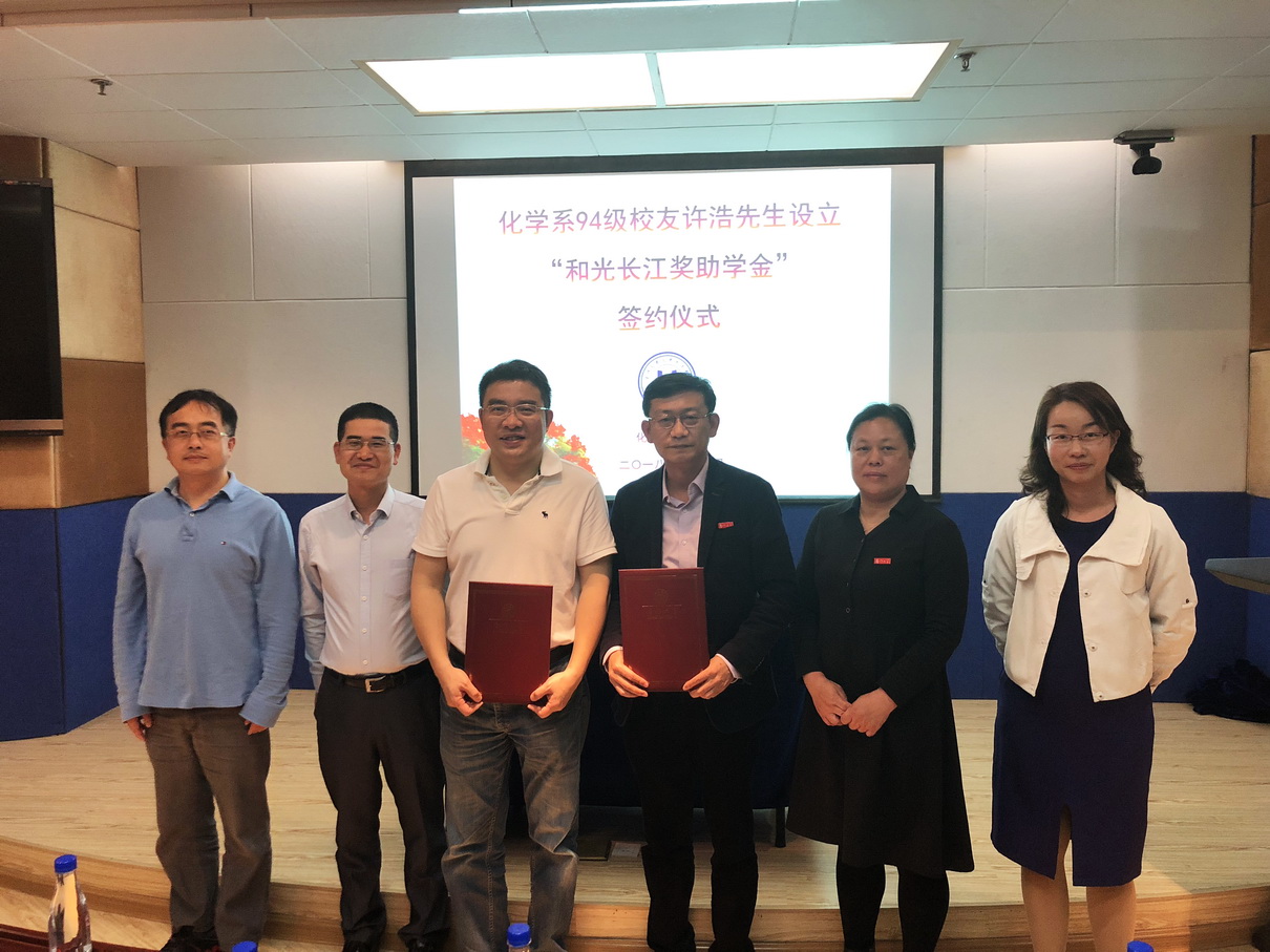 4月6日晚,海洋之神8590cn官网建校97周年校庆系列活动之化学系94级校友许浩“和光长江奖助学金”签约仪式在卢嘉锡楼202报告厅顺利举行。学院党委书记宋毅,许浩先生的同窗好友、海洋之神8590cn官网郑南峰教授,信息科学与技术学院计算机系刘向荣教授,学院团委书记刘恩恩、外事和校友秘书陈沁芳,以及获得“和光长江奖助学金”的学生代表们出席了本次仪式。签约仪式由学院党委副书记李芬芬主持。