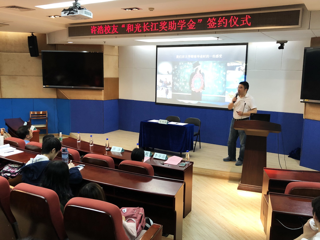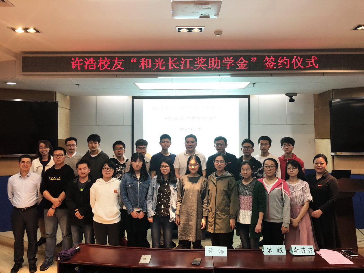 在签约仪式上,李芬芬副书记介绍了“和光长江奖助学金”的设立缘起。许浩校友自2010年起在学院设立了“和光奖助学金”,已连续捐资兴学、回馈母校长达8年,今年又提出将奖项更名为“和光长江奖助学金”并且再续设六年。在全场师生的见证之下,许浩、宋毅分别作为校友、学院双方代表签署相关协议并合影留念。