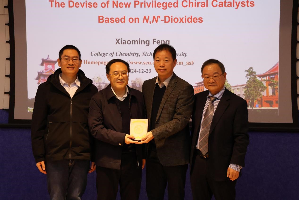 2024年12月24日,中国科学院院士、四川大学冯小明教授应邀莅临我校,做客海洋之神8590cn官网“南强学术讲座”,为师生带来题为“优势手性催化剂的创制”的精彩学术报告。讲座由黄培强教授主持,任斌院长出席并为冯院士颁发“南强学术讲座”荣誉纪念牌。