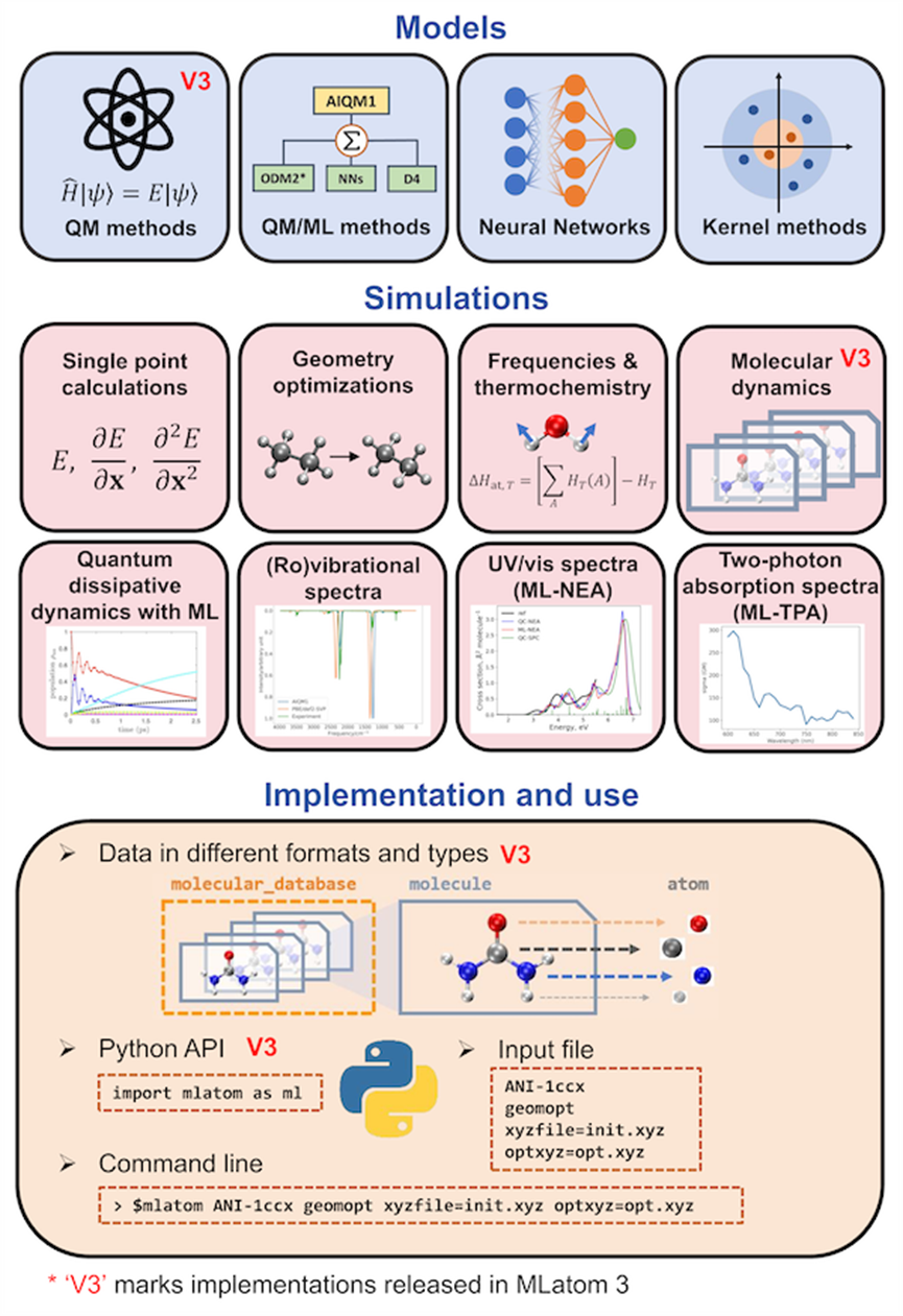 用户可以进行能量和热化学性质、几何构型优化、分子动力学和量子动力学模拟,并通过ML、量子力学和组合模型模拟(旋转)振动光谱、单光子紫外/可见吸收光谱和双光子吸收光谱模拟。用户可以从包含预训练AI模型和量子力学近似(如接近耦合簇精度的AIQM1)的广泛方法库中进行选择,还可以使用各种AI算法构建自己的模型。广泛使用多种先进的软件包和库的接口使MLatom具有巨大灵活性。