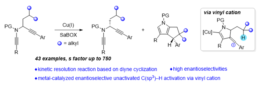 叶龙武教授课题组基于其前期廉价金属催化1,5-二炔环化反应(J. Am. Chem. Soc. 2019, 141, 16961; J. Am. Chem. Soc. 2020, 142, 7618; Chem. Sci. 2021, 12, 9466; Angew. Chem. Int. Ed. 2022, 61, e202115554; Angew. Chem. Int. Ed. 2022, 61, e202210637; Angew. Chem. Int. Ed. 2023, 62, e202303670; Chem. Sci., 2023, 14, 3493; Nat. Commun. 2023, 14, 7058)的研究基础,从炔丙位带有支链的二炔底物出发,将廉价金属Cu(I)与上海有机所唐勇院士课题组发展的带有大位阻边臂的双噁唑啉(SaBOX)手性配体相结合作为催化剂,通过动力学拆分的方式高效高对映选择性地构建系列手性吡咯并环骨架和手性二炔骨架。该反应具有以下特点:(1)通过远程立体化学控制策略,首次实现了金属催化的烯基阳离子参与的不对称惰性C(sp3)–H键插入反应;(2)建立了基于炔烃的不对称惰性C(sp3)–H键转化;(3)首次利用二炔环化的方式实现动力学拆分反应。该反应具有良好的底物普适性,对于大多数底物表现出优秀的对映选择性,动力学拆分选择性因子最高达750。通过密度泛函理论(DFT)计算,进一步明晰了该类不对称催化反应的机理和动力学拆分机制。
