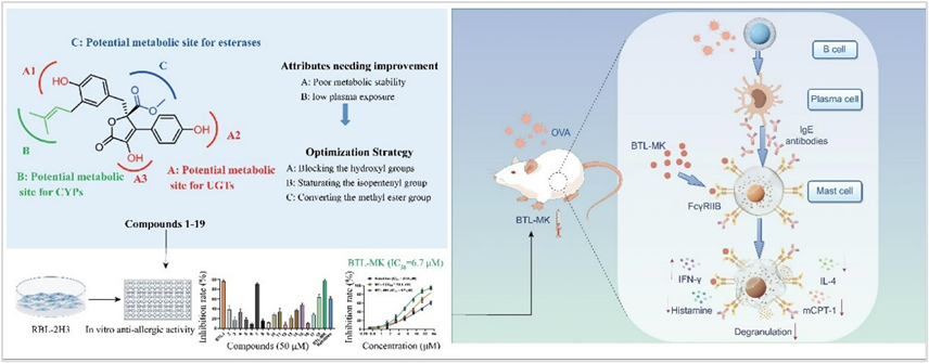 海洋天然产物丁内酯IBTL-I)由杨献文团队从海洋微生物Aspergillus sp.中分离得到,能够有效地抑制肥大细胞(mast cells, MCs脱粒效果,发挥抗过敏效果,然而BTL-I代谢稳定性差,在大鼠体内的低暴露和不佳的药代动力学行为(PK)限制了其在体内的应用。