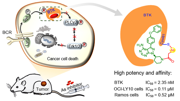 为了克服传统砷药物选择性差、亲和力低的问题,课题组设计合成了一系列具有不同价态、不同甲基化状态、不同巯基保护基团、以及不同长度和大小的短碳链和苯环有机砷弹头;进一步将这些砷弹头与激酶靶向基团偶联,得到了一系列砷基共价靶向抑制剂。在砷弹头与激酶靶向基团的协同作用下,砷基靶向抑制剂可以高选择性、高亲和力的与目标激酶蛋白特异性结合,有效抑制目标激酶的活性。课题组以B细胞淋巴瘤的癌蛋白布鲁顿酪氨酸激酶(BTK)为靶点,在分子、细胞和小鼠水平上评价了砷抑制剂对BTK的抑制活性。结果表明得益于砷硫键的天然可逆共价性质,砷基靶向抑制剂可以高选择性、高亲和力与BTK可逆共价结合,对BTK及其介导的BCR癌症信号通路实现了nM级别的抑制,高效抑制癌细胞和小鼠移植瘤的增殖。该工作克服了传统砷药物选择性差、亲和力低的问题,为未来进一步开发新型砷基可逆共价靶向抑制剂提供了行之有效的思路,有望极大地拓大砷的药用价值。