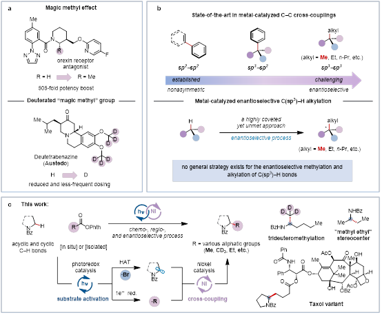 在药物开发中,脂肪族小烷基基团的战略性引入,特别是甲基,已被证实能够显著增强潜在药物分子的生物活性(图1a)。这种增强是通过优化分子的三维构型、脂溶性和代谢过程来实现的。这种现象通常被称为魔法甲基效应,其对于a-手性脂肪胺结构尤为显著。此外,选择性地引入魔法氘代甲基有望进一步改善药效,使其成为药物优化和开发的重要工具。然而,C(sp3)-C(sp3)键的催化不对称构建仍然是有机合成中的一个重大挑战(图1b)。碳氢键活化一直被视作化学的圣杯sp3 C-H键官能团化则是圣杯中的明珠,是实现小烷基基团催化不对称引入的理想化方法。然而,sp3 C-H键的催化不对称烷基化是合成化学领域公认未解决的科学难题,因为相邻的sp3 C-H键通常具有非常相似的立体和化学性质,这个过程需要复杂的催化剂和精心设计的反应条件,才能实现化学选择性、区域选择性和对映选择性的同时控制。目前,针对非酸性C(sp3)-H键的不对称烷基化(例如甲基化、乙基化等)的通用策略尚未建立,这凸显了探索新的反应机制和催化策略的迫切需要。