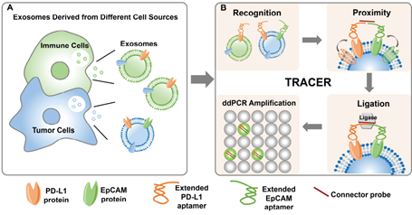 外泌体是由细胞向胞外和体液中释放的微囊泡,携带多种生物信息并参与许多重要的生理病理过程,是一种重要的液体活检靶标。已有研究证明,外泌体膜上程序性死亡配体1(Exo-PD-L1)是肿瘤诊断以及免疫治疗疗效预测的一种重要靶标。然而Exo-PD-L1具有肿瘤细胞、免疫细胞、间充质干细胞等不同细胞来源,而现有分析方法难以实现不同细胞来源Exo-PD-L1的准确区分。因此,需要开发一种外泌体靶标蛋白溯源方法,实现肿瘤来源外泌体靶标蛋白的精准测量,有助于探究肿瘤外泌体与生理病理过程相关性及推动基于肿瘤外泌体的精准诊断应用。