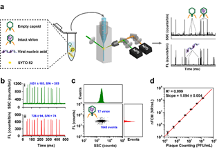 针对这一难题,颜晓梅教授课题组利用实验室自主研发的纳米流式检测技术(Nano-flow cytometry, nFCM),结合病毒核酸荧光标记,通过散射和荧光信号的同时检测,发展了病毒的单颗粒多参数定量检测技术,实现了对复杂样品中病毒浓度和纯度的准确、快速测定。以粒径仅为60 nm的T7噬菌体为例,nFCM能够在单颗粒水平区分完整的病毒颗粒、病毒空壳和游离的病毒核酸,获得病毒各个组分的浓度和比例。该方法成功地应用于腺病毒载体、噬菌体鸡尾酒制剂和兽用疫苗等多种病毒生物制剂的测定,并考察了病毒疫苗生产纯化过程中病毒组分和纯度的变化,实现了对疫苗生产过程的动态监测,对疫苗的上游工艺开发具有重要的指导意义。相较于荧光定量PCR测定的病毒基因组滴度,nFCM测定的病毒物理滴度更接近空斑法测定的病毒活性滴度,并且将检测时间从空斑法的4-10天缩短至30 分钟。nFCM可应用于DNA、RNA、包膜和非包膜等各类病毒的检测,也可以对病毒表面蛋白、病毒包膜、荧光修饰的病毒等进行检测,具有广泛应用前景。