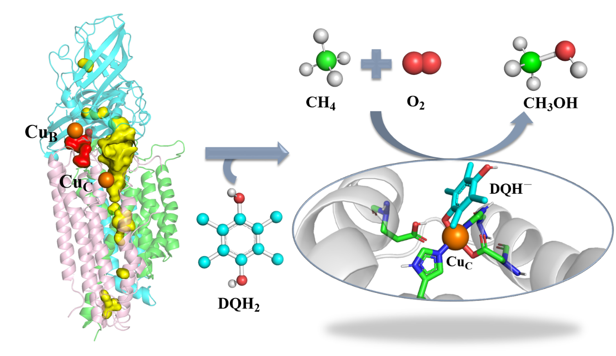 甲烷是仅次于二氧化碳的第二大温室气体,其温室效应是二氧化碳的84倍。早在110年前,人们就已经发现自然界中存在甲烷营养菌,其能够在温和条件下催化甲烷至甲醇的转化。然而,由于其结构的复杂性,实验对于微粒甲烷单加氧酶催化机理的研究,尤其是O2的活化机制及其相应的活性中间体的认识尚不清楚。