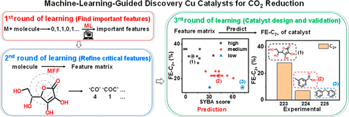 该研究通过三个迭代周期探索了CO2电还原Cu催化剂(电化学沉积制备)的添加剂:实验测试à机器学习分析à预测和重新设计,获得了对CO、HCOOH和C2 +产物具有高选择性的催化剂。研究发现含有脂肪族羟基的分子添加剂可以通过控制催化剂前驱体Cu2O立方体的形成来提高C2+产物的法拉第效率。这一工作凸显了机器学习通过从有限数量的实验数据中有效提取信息来加速材料开发的潜力。虽然只研究了约300个不同催化剂,机器学习对数据的高效分析复现了近年来铜基催化剂研究的主要结论,并获得了新的知识。