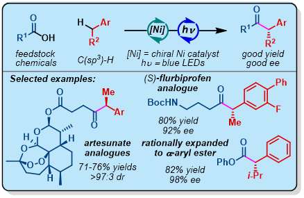 手性α-芳基酮,是一个非常重要的药效官能团,广泛存在于药物分子中,例如布洛芬(Ibuprofen)和萘普生(Naproxen)。虽然含有α-季碳手性中心的芳基酮的不对称合成已经有较多报道,但是相应的具有α-叔碳手性中心的芳基酮的高效不对称合成依然极具挑战性,因为相对活泼的叔碳手性中心很容易发生外消旋化。针对此类化合物的不对称合成,目前的主要方法包括过渡金属催化的活泼金属试剂和酰基卤代物的交叉偶联反应、酰基卤代物和苄基卤代物的还原偶联反应、芳香烯烃和酰基亲电试剂的还原偶联反应。这些方法高度依赖于活泼金属试剂、预制备的活泼酰基卤代物、当量还原剂的使用,步骤经济性、官能团兼容性和操作简便性都有待进一步的提高。
