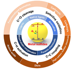 木质纤维素是最主要的可再生碳资源,将其转化成碳基化学品和液体燃料是生物质转化利用的理想途径之一。光催化已成为温和条件下生物质高效高选择性转化利用的新兴方法。C−O、C−C键的选择性裁剪和特定官能团的定向活化是光催化木质纤维素转化的关键挑战。近年来,已有研究发现金属硫化物半导体可实现高效光催化C−H键活化、C−O键切断、C−C偶联、选择性氧化等生物质选择性转化中具有挑战性的反应过程。金属硫化物在光催化木质纤维素选择转化中取得了重要进展,包括:木质纤维素解聚制平台分子;平台分子转化制醛、酸、高碳化合物、二元醇及氨基酸等。本综述对近期金属硫化物光催化木质纤维素选择转化的重要研究进展进行了系统总结与梳理,从材料性质角度解析了金属硫化物在木质纤维素转化过程中的优势,详细介绍了金属硫化物在特定光催化木质纤维素转化反应中的应用。综述重点讨论了金属硫化物在光催化木质纤维素相关平台分子选择转化中的催化机理,对金属硫化物性质及其在生物质转化反应过程中的独特作用进行分析,为高效高选择性的光催化剂设计提供借鉴,并对金属硫化物在光催化木质纤维素转化领域中的挑战和机遇进行了系统总结和展望。