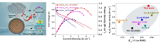 在催化剂制备中,首先在ZnCo-ZIF前驱体表面包裹SiO2涂层。由于ZnCo-ZIF比SiO2层软得多,热膨胀特性的差异使两者在热解过程中发生各向异性收缩,导致ZIF骨架结构外部产生局部应力,从而使CoN4活性位点发生原子级结构变形,形成了变形的钴单原子碳氮催化剂d-(CoSA-N-C);然后,利用气相热扩散方法将乙酰丙酮钴升华到d-(CoSA-N-C)上,得到含有变形碳层协同的复合活性位的催化剂d-(CoNP/CoSA-N-C)该制备方法不仅能够形成CoNP-CoN4复合活性位点,也有效地增加了Co-N4活性位的总体密度。实验和DFT计算结果均表明,CoNP-CoN4复合位点和变形碳层上的CoN4位点均能有效促进O2的解离吸附,增强氧自由基的吸附,抑制H2O2的形成,极大地减少了催化剂碳层的腐蚀,提高了催化剂的ORR活性和耐久性。此外,由于催化剂具有丰富的介孔结构,在活性位周边形成了更多的三相边界,有效提高了O2的传质和电荷的传输效率,从而提高了PEMFC的功率密度,在2 bar条件下Pmax-H2-O2达到1.207 W cm-2。