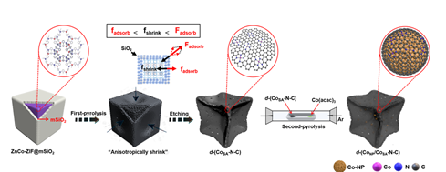Co单原子(CoSA)催化剂具有Fenton效应较弱、活性位点Co-N4的结构稳定性好等优点,但对氧分子(O2)的解离吸附能力较弱,氧还原反应(ORR)性能低。因此,课题组提出了一种利用软硬模板在热解过程中产生的局部应力与气相热扩散相结合的策略,构筑了一种变形CoN4与CoNP-CoN4复合活性位共存的新型催化剂,显著提高了钴单原子碳氮催化剂的ORR活性和稳定性。