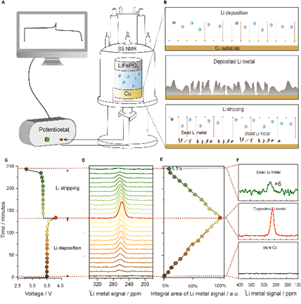 针对这一问题,杨勇教授课题组利用自建的电化学原位固体核磁共振装置,原位观察锂金属的动态沉积/溶解过程,并通过定量的7Li核磁共振谱学技术量化循环过程形成的各种非活性锂,探讨了NMR定量技术、滴定气相色谱技术 (TGC) 以及质谱滴定技术(MST)在分析“死锂”组份产生差异的原因来自氢化锂(LiH)。通过更为可靠的NMR定量方法,研究了锂金属电池在典型的电流密度、电解液添加剂和锂盐浓度条件下的失效机制。通过这些定量,揭示了锂金属电池的两阶段失效过程,并提出了抑制非活性锂形成的策略。