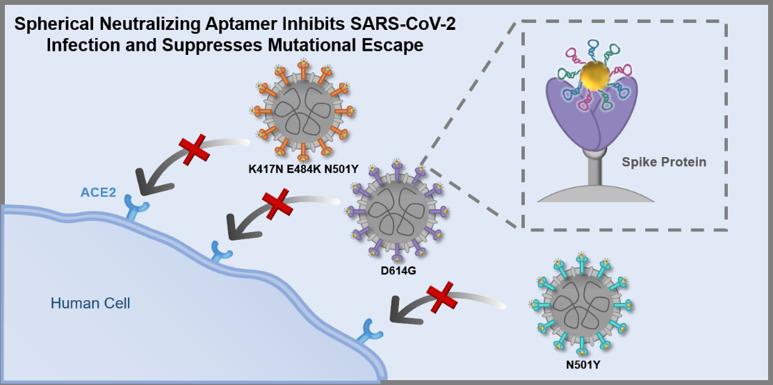 近日,海洋之神8590cn官网杨朝勇教授课题组在新冠中和治疗领域取得新进展,相关成果以" Spherical Neutralizing Aptamer Inhibits SARS-CoV-2 Infection and Suppresses Mutational Escape"为题,发表于《美国化学会志》(J.Am.Chem.Soc. DOI: 10.1021/jacs.1c08226)。
