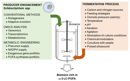 膳食摄入ω-3长链多不饱和脂肪酸 (ω-3 LC-PUFA),尤其是具有代表性的二十二碳六烯酸 (DHA) 和二十碳五烯酸 (EPA),是人体自身不能直接从头合成而又不可缺少的重要营养素。另外,目前水产养殖行业依赖于野生捕捞的鱼油作为渔业饲料中所需的ω-3 LC-PUFA营养物质来源,严重阻碍了水产养殖业的可持续发展。几十年来,含油微生物已被开发为ω-3 LC-PUFA的替代来源。裂殖壶菌 (Aurantiochytrium spp.) 是目前工业化发酵生产ω-3 LC-PUFA的代表性微生物之一,它具有高生物量、高油脂含量、易培养等特点。