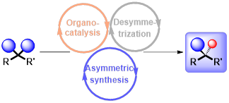 对映选择性的去对称化反应可从简单易得的前手性或内消旋底物出发,在反应位点和前手性中心上同时构建多个手性中心。与动力学拆分相比,其理论产率可达到100%。由于这些独特的优势,去对称化被普遍认为是不对称合成中的重要策略之一,一直以来备受关注。有机小分子催化是除金属催化和酶催化外第三类不对称催化模式,具有催化剂易制备、反应条件温和、对环境友好等特点。去对称化策略和不对称有机小分子催化的高效结合不仅促进相关合成方法学的发展,且能为复杂手性分子的制备提供全新的路径。