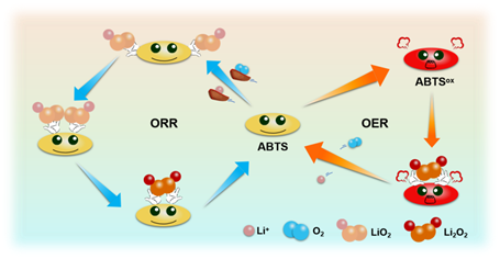 该工作在前期研究基础上进一步开展氧气电极液相催化研究,首次将2,2'-偶氮-双(3-乙基苯并噻唑啉-6-磺酸)二铵盐(ABTS)分子引入锂氧气电池体系。在放电过程中,高度对称ABTS分子两端的各有一个SO3-和NH4+离子对,有如“钳形”,可俘获两个LiO2分子,形成ABTS(LiO2)2中间产物,使其发生分子内歧化反应,促进电解液中Li2O2产物的快速生成,抑制超氧化物相关的副反应并改善了氧气正极的钝化问题;充电时,由于ABTS自身可以发生可逆的氧化还原反应和良好的电子转移能力,可以作为一种高效的氧化还原介质(RM)改善Li2O2氧化分解动力学。通过上述放电和充电过程中的双功能作用,实现了锂氧气电池更低的充放电过电位,更高的放电容量以及更长久的循环。
