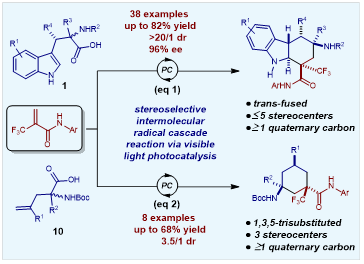 随着制药工业对复杂三维环状分子的需求逐渐增长,发展新型、高效的合成方法学来快速构建这类分子受到越来越多的关注。自由基串联反应可以快速地合成复杂三维立体分子。然而,许多自由基反应通常需要使用有毒的试剂。近年来,利用可见光催化在温和的条件下产生自由基物种并用于串联反应,已经成为新型的自由基反应策略。尽管该策略可以构建多种环状化合物,取得了不错的进展。但是,许多自由基串联环化反应仍然依赖于精心设计的前体或者基于分子内的设计,大大降低了它们的实用性。因此,通过可见光催化的分子间立体选择性的自由基串联反应,从简单的原料出发合成复杂的含有多个立体中心的环状化合物亟待发展。