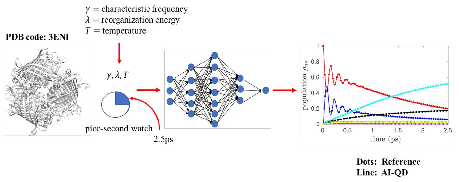 地球上生物体内所有的能量都直接或者间接来源于太阳能。通过光合作用,植物、藻类和光合细菌能够将光能转化为化学能。光合作用系统由捕光天线、反应中心和激子转移复合物组成,这种激子转移复合物能高效地将光能从天线传输到反应中心,如绿硫细菌中的Fenna-Matthews-Olsen (FMO)配合物,具有接近单位的转移效率,引起了学界的广泛关注。目前,已经开发了许多量子动力学方法(如HEOM、SEOM、QuAPI和LTLME等)用于研究激子转移系统中的激发能量转移。然而,这类传统方法都要求递归地传播动力学,其中每个时间步都取决于其自身先前的值,且不允许在不传播轨迹的情况下对系统进行预测,从而导致了高昂的计算成本,而且也容易累积错误。因此,传统方法在上述复杂激子转移复合物的研究上遇到了困难。
