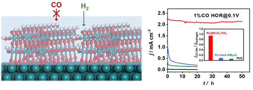 贵金属电催化剂的毒化是影响燃料电池性能的一个瓶颈问题。但前工业氢气来源于化石燃料重整氢和副产氢,但往往含有微量的一氧化碳、硫化氢等,其在贵金属表面强烈吸附会导致催化剂中毒而失活。传统抗CO毒化策略是通过在Pt催化剂表面引入第二元的亲氧金属(如Ru),利用双功能机制促进表面吸附的CO氧化脱除。然而,燃料电池阳极的工作电位低,CO氧化速率很慢,难以抵消其累积速率,工况条件下几个ppm的CO就会产生严重的毒化问题。为解决这一难题,研究团队另辟蹊径,制备了无定型水合氧化钌包裹的金属钌电催化剂,利用水合氧化钌层对CO扩散与吸附的阻碍作用,提高催化剂对CO的耐受性。在水溶液测试条件下,该催化剂可在含1% CO的氢气中稳定工作50小时,抗毒化性能比商业PtRu/C提高了两个数量级。对照实验表明,该催化剂的抗毒化机制难以采用传统的双功能机制与吸附能调控来解释。为了进一步认识氧化物阻隔层提高抗毒化性能的机制,研究团队利用从头算分子动力学方法进行模拟。结果表明氧化物修饰层可以使得金属钌表面的界面水覆盖度上升,而高覆盖度的界面水使得CO的近表面扩散与吸附的能垒都显著上升,从而阻碍其吸附。电化学原位红外光谱实验结果表明,在金属氧化物修饰层存在时界面水的覆盖度显著增加,证实了从头算分子动力学模拟的理论预测。该研究提供了一种通过构筑表面氧化物阻隔层而提高燃料电池阳极催化剂抗毒化的新策略。