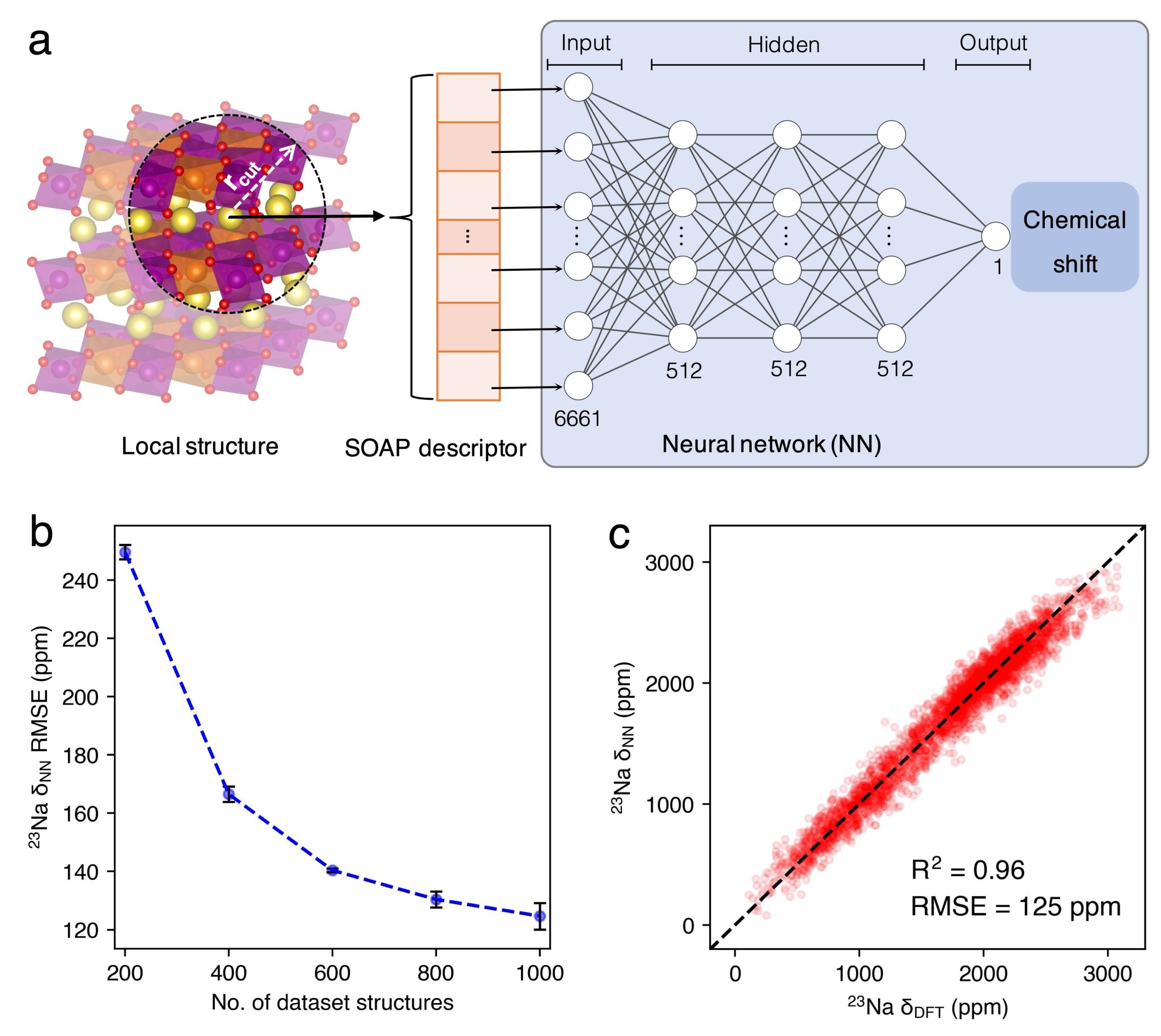 针对以上问题,本工作中通过联合DPMD模拟进行快速结构采样,和机器学习方法快速预测结构的化学位移,可在DFT精度下计算动态NMR化学位移。具体的,建立了一个基于DFT数据集,结合原子位置平滑重叠描述符(Smooth Overlap of Atomic Positions, SOAP)和神经网络(Neural Network, NN)的机器学习模型,名为NN-NMR模型。以P2型Na2/3(Mg1/3Mn2/3)O2为例验证了该模型,结果表明NN-NMR模型可以较好的复现DFT计算结果(R2 = 0.96)。此外,NN-NMR模型在GPU卡上计算时间与DFT方法在CPU核上计算时间相比,缩短了几个数量级。联合NN-NMR和DP两个模型的高效率和精度,该方法基本消除了P2型Na2/3(Mg1/3Mn2/3)O2和Na2/3(Ni1/3Mn2/3)O2动态23Na化学位移计算值的统计误差,并与实验测量结果一致。该方法可用于建立高倍率电池正极材料结构,NMR谱,离子传输之间的明确关系,且有潜力推广到其他的原子核,固态电解质,溶液体系中,作为联系实验NMR谱和微观动态过程的桥梁。