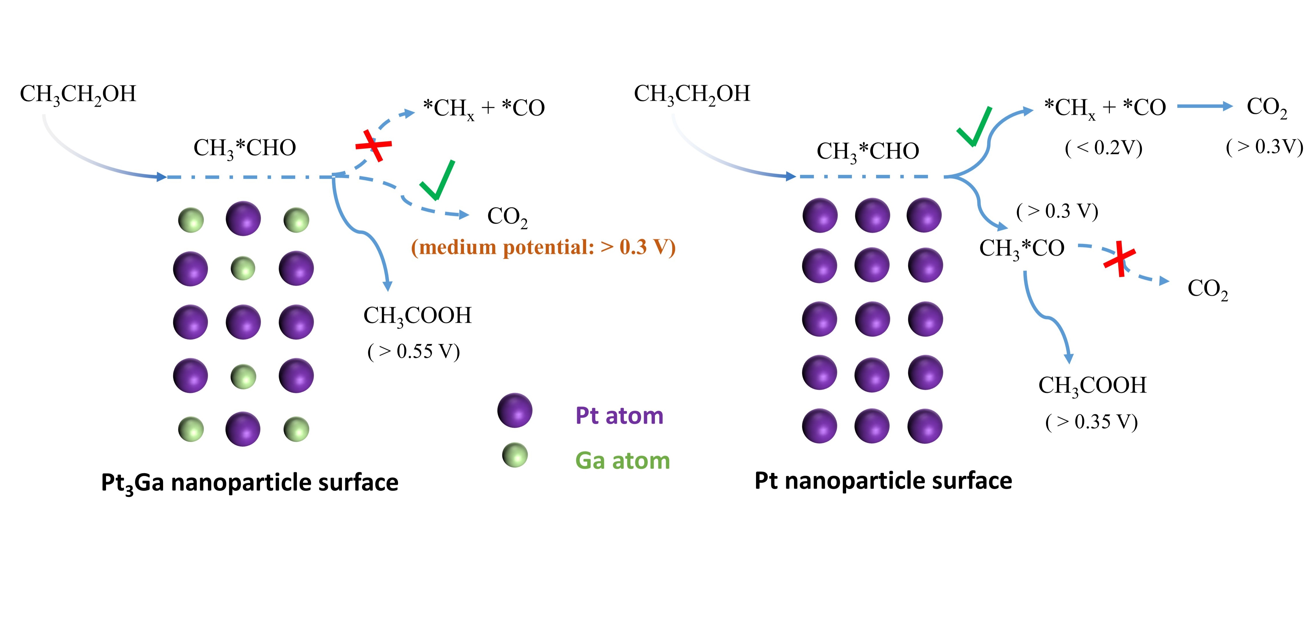 基于乙醇分子吸附氧化的机理,研究团队设计合成了一种表面Ga改性的PtGa纳米合金粒子,Ga原子吸附水分子所形成的Ga-(H2O)x具有隔绝连续Pt位点的效果,通过原位电化学红外光谱方法发现乙醇分子在催化剂表面吸附后未发生C-C健的解离,中间物种停留在C2物种(乙醛),避免了C1毒化路径。随着电位升高,Ga-(H2O)x释放质子形成Ga-(OH)x,OH物种促进乙醛进一步氧化,从而实现在中低电位下(0.3 - 0.55 V vs. SCE)乙醛分子完全氧化到CO2的过程。并且该过程的真实性也通过乙醇同位素标记法和以乙醛分子作为直接反应底物得到了证实。研究团队还通过DFT理论计算阐明了Pt-Ga合金催化剂表面Ga的超强亲水性质以及提供OH物种的能力。该项研究提出了乙醇氧化的新机制,即C2完全氧化反应途径,对高效利用乙醇能源提供了可能性,有利于直接乙醇燃料电池的发展。