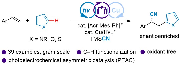 手性腈作为生物活性化合物的关键结构单元和广泛应用的合成中间体,其制备方法一直备受科学家们的关注。其中,烯烃的对映选择性自由基氰基化已经被证明为一种有效的制备策略。然而,现行的烯烃碳氰化反应需要使用具有预官能团化的碳自由基前体,这一要求增加了其制备的复杂性。烯烃的不对称芳氰化任极具挑战,因为现有的唯一方法需要使用危险的芳基重氮盐试剂。在此背景下,徐海超课题组利用其团队发展的光电不对称催化策略,通过C–H官能团化,实现了烯烃的对映选择性杂芳基氰化。该方法采用吖啶盐和手性铜络合物为催化剂,通过杂芳烃自由基阳离子过程,实现了将易于获取的芳基烯烃和未经官能团化的杂芳烃高效、高对映选择性地转化为手性腈。
