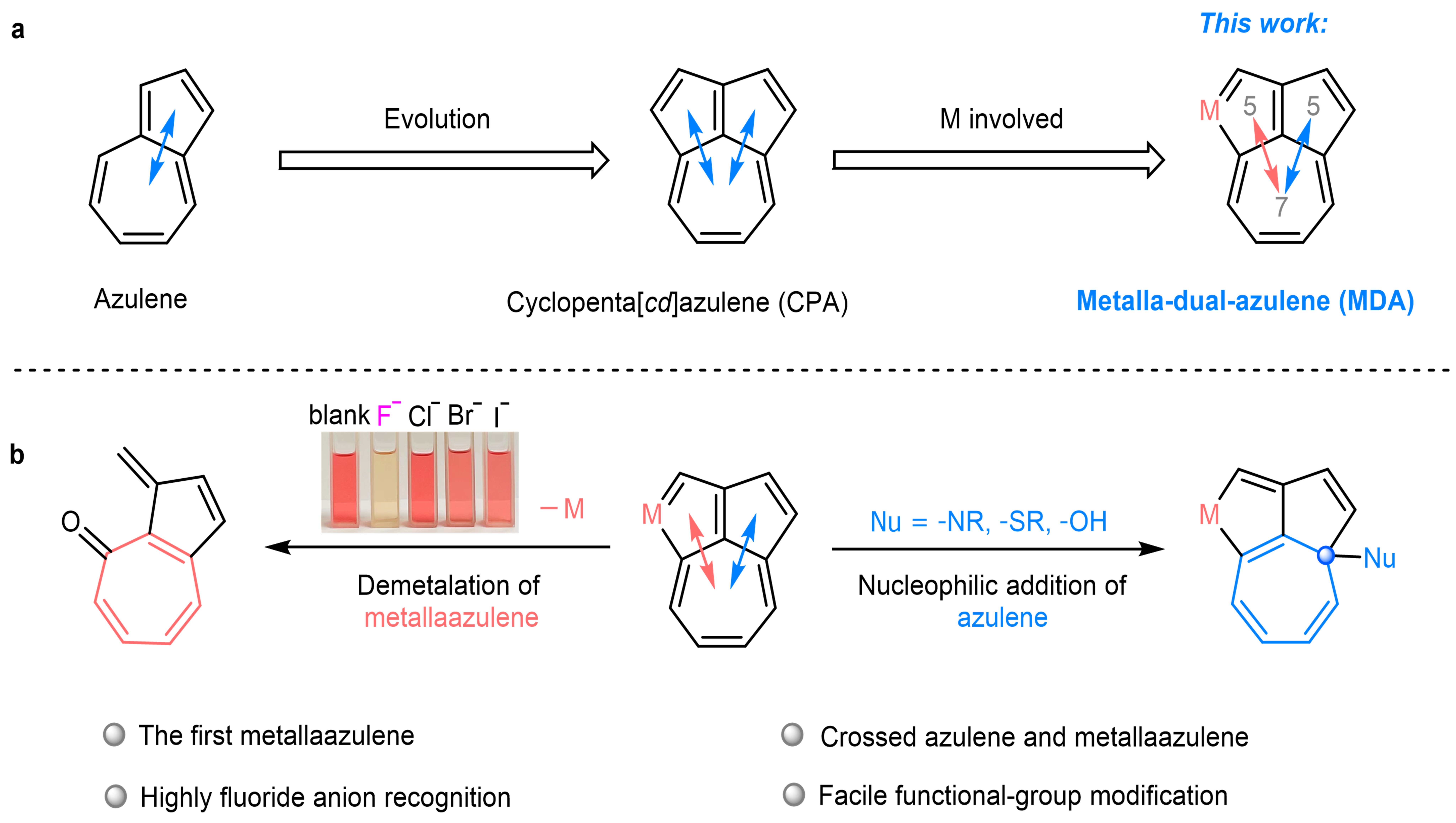 本工作开发了一种高效的[5+2]环化反应策略,构建了一种独特的金属[5-5-7]骨架,可以看作是一个金属薁与一个有机薁共享7元环骨架,形成独特的金属杂双薁。有趣的是,两种薁基元展现出不同的反应性:有机薁基元能与多种亲核试剂发生亲核加成反应,生成一系列官能化的环庚三烯衍生物;而金属薁基元在氟离子溶液中发生脱金属反应,展现出优异的氟离子识别性能。在13种阴离子的混合物中,金属杂双薁表现出对氟离子的特异性识别,溶液发生了肉眼可见的颜色响应,检测限为9.73 × 10-7 M,对氟离子的检测灵敏度高,且对其他阴离子的抗干扰能力强。