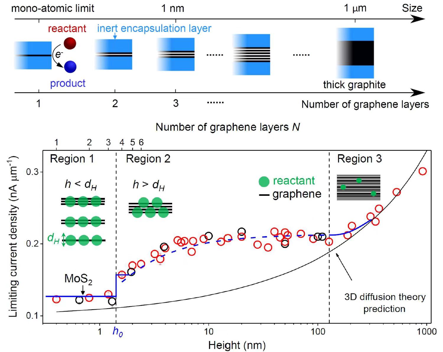 基于此,研究团队通过在单原子精度连续地从微米至埃尺度调控电极尺寸,实现了埃尺度电化学的研究。这种电极是将不同厚度的石墨烯封装在绝缘的氮化硼晶体内,而仅暴露出石墨烯的边缘作为反应电极。通过控制石墨烯的层数即能精准控制电极尺寸。实验结果表明,石墨烯电极上电化学反应的极限电流密度表现出明显的尺寸效应。当电极厚度小于反应离子的水合直径时,改变电极厚度不影响极限电流密度。这是由于电极表面所有的可用空间都被密堆积的反应物种占据。只有当电极厚度大于单个反应离子的水合直径时,才会产生额外的反应位点。此时,极限电流密度突增。显然,这种极限电流随电极尺寸突变的现象是埃尺度电极上的独有行为。随着电极厚度继续增大至百纳米尺度,传统的三维扩散理论描述的电化学极限电流显著小于实验中的观测值。进一步的研究表明,反应物可以沿着氮化硼边缘表面向石墨烯边缘扩散,从而为反应传质提供了除溶液扩散的额外通路。当电极厚度大于100 nm时,极限电流密度可以用传统的三维连续扩散模型很好地描述。另一个埃尺度电极上独有的现象是,即使处于极限电流的条件下,反应仍存在势垒且该势垒的大小与反应产物价态的绝对值成正比。这一结果表明,反应产物与电极之间的静电相互作用使得产物难以从电极表面脱离。该行为在空间上阻碍了后续反应物与电极表面的接触,并决定了埃尺度电极的电化学反应速率。