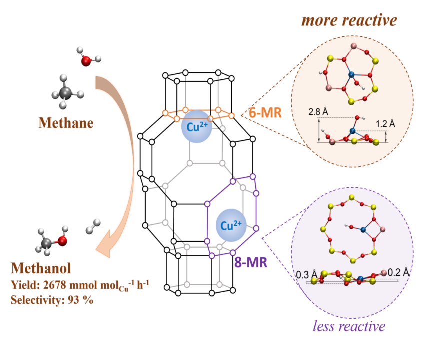 本研究利用离子交换法成功将Cu2+离子选择性引入SSZ-13分子筛的6元环孔道(6MR)中,而非8元环孔道(8MR),合成出具有特定限域环境的Cu单位点催化剂(Cu1/SSZ-13)。研究发现,该催化剂可高效实现甲烷-水蒸气连续转化合成甲醇,在400 °C下甲醇时空收率达2678 mmol molCu-1 h-1,选择性达93%,远高于相关文献报道结果。理论计算表明,相较于8MR孔道,6MR孔道具有更强的限域作用,使Cu活性位在甲烷氧化反应中表现出更低的形变能,利于产物甲醇的快速脱附。该工作揭示了分子筛限域铜单位点在催化甲烷氧化直接合成甲醇反应中的优异性能,为开发高效铜基分子筛限域催化剂提供了新思路。