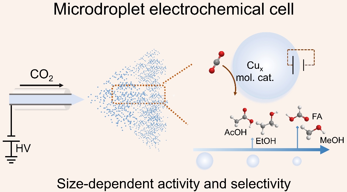 化学反应通常在体相溶剂中进行。近年来,人们发现相比于在体相溶剂,微液滴界面的化学反应速率呈现数量级的提升。这一独特现象的形成是由于微液滴界面多种异常物理化学特性的耦合。其中,微液滴界面电场(109 V/m)的存在不仅可以显著影响反应分子/中间物种的取向,同时也会形成电化学势来驱动界面的电化学反应。与传统的电化学反应相比,微液滴的电化学池不依赖于固体电极的限制,可直接实现气液界面的电化学反应。