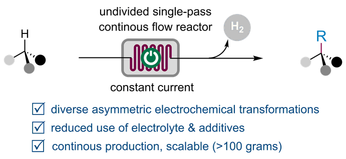 在催化不对称合成领域,研究较少的途径是氧化型催化不对称转化。确定合适的化学氧化剂并解决它们与催化剂和官能团的相容性问题,存在重大挑战。有机电化学使用无痕的电子促进氧化还原反应,是一种很有前景的解决方案。然而,常用的批式电解槽电解会产生其自身的一系列挑战,阻碍了电化学不对称催化的发展。