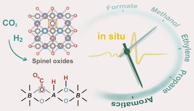 传统上CO2加氢制多碳化学品主要使用改性的金属基费托合成催化剂,但由于费托合成表面聚合机理的限制,其加氢产物分布宽,难以高选择性获得单一的烃类产物。王野教授团队近年来发展了用于精准调控产物选择性的金属氧化物-分子筛接力催化体系,在COCO2加氢高选择性制多碳化学品领域取得系列重要进展。本工作结合多种原位谱学表征,在原子层面上系统研究了尖晶石型金属氧化物催化CO2加氢制甲醇的反应网络,解析了CO2吸附/活化和H2解离的活性位,并揭示了表面碳物种和氢物种的演变规律。在此基础上,本工作进一步构建了一系列尖晶石-分子筛双功能催化剂,通过接力催化实现了CO2直接高选择性加氢制多种高附加值产物,如乙酸(48%)、乙烯(58%)、丙烷(80%)、丁烷(50%)、低碳烯烃(92%)和芳烃(70%),且选择性灵活可调,为CO2的选择性加氢转化提供了新策略。