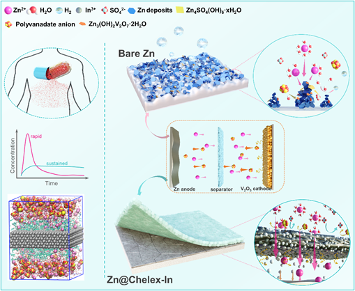 近日,海洋之神8590cn官网赵金保教授/杨阳副教授团队在锌金属电池负极界面调控的研究中取得新进展,相关成果以“Stabilizing Zn/electrolyte Interphasial Chemistry by a Sustained Release Drug Inspired Indium-Chelated Resin Protective Layer for High-Areal-Capacity Zn//V2O5 Batteries”为题发表在Angew. Chem. Int. Ed.上,并评选为“Hot Paper”(DOI: 10.1002/anie.202405593)。