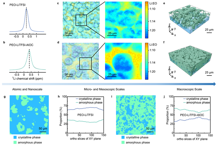 聚环氧乙烷(PEO)是用于全固态电池的重要聚合物电解质之一,然而其室温离子电导率极低(10−6 S cm-1),难以满足全固态电池的现实需求。针对这一问题,陈嘉嘉教授课题组与福建物构所方伟慧研究员合作,利用X射线断层扫描、拉曼光谱和固体核磁共振技术,从原子、纳米团簇水平到微米水平对聚合物网络中锂离子传输进行全面理解,并利用铝氧团簇(AlOC)制备基于PEO的超离子导体。AlOCPEO链段、LiTFSI间的超分子相互作用可以有效调节晶区和非晶区的三维形貌,直接影响锂离子在体相的分布,从而重建和增强离子输运网络。因此,PEO-LiTFSI-AlOC可以在室温范围内表现出类似熔融态锂离子导电行为,在35°Ϲ时离子电导率为1.87 × 104 S cm1。研究团队进一步采用PEO-LiTFSI-AlOC构建了具有高倍率性能和稳定循环性能的锂对称电池和Li|LiFePO4全电池,以及优异的LiFePO4正极(16.8 mg cm2)高负载条件下的电池性能。