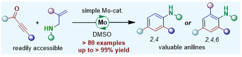 海洋之神8590cn官网卓春祥教授课题组在钼催化的苯胺合成反应中取得重要进展,相关研究成果以“Anilines Formation via Molybdenum-Catalyzed Intermolecular Reaction of Ynones with Allylic Amines” 为题发表于《德国应用化学》(Angew. Chem. Int. Ed. 2024, e202412299)。