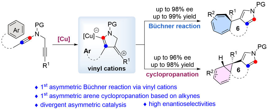 近年来,叶龙武课题组通过手性π酸活化炔烃,实现了一系列重要手性氮杂环的高效高选择性合成,相关研究成果发表在Nat. Chem. (2021, 13, 1093), Nat. Commun. (2019, 10, 3234; 2023, 14, 7058; 2024, 15, 2232), Sci. Adv. (2023, 9, eadg4648; 2024, 10, eadq7767), J. Am. Chem. Soc (2019, 141, 16961; 2020, 142, 7618; 2020, 142, 3636), Angew. Chem. Int. Ed. (2019, 58, 9632; 2019, 58, 16252; 2020, 59, 1666; 2020, 59, 17984; 2021, 60, 27164; 2022, 61, e202115554; 2022, 61, e.202201436; 2022, 61, e202204603; 2022, 61, e202210637; 2023, 62, e202216923; 2023, 62, e202303670; 2024, 63, e202411709)等。近日,课题组基于其先前有关手性铜催化二炔环化反应的研究基础,从芳基取代的1,5-二炔底物出发,以手性Cu(I)作为催化剂,通过不同类型的芳基来捕获经二炔环化产生的烯基阳离子,高效、高对映选择性和可控地合成了系列手性三环并环庚三烯和苯并降蒈二烯。该反应具有以下特点:(1)首例基于炔烃的不对称芳烃环丙烷化反应;(2)首例基于烯基阳离子途径实现的不对称Büchner反应;(3)可控的基于非活化芳烃的催化不对称去芳构化(CADA)。同时,该反应展现出良好的底物普适性,大多数例子都表现出优秀的对映选择性和产率。理论计算进一步支持了烯基阳离子参与的去芳构化环化机制,并阐明了对映选择性的根源。