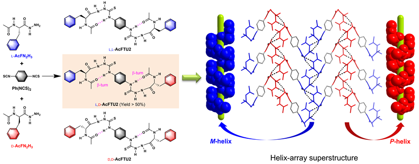 有趣的是,该项研究起因于一个梦境,梦见对苯二异硫氰酸酯与外消旋乙酰基-L-/D-苯丙氨酰肼的反应为异手性偶合!当时实验室正在研究氨基酸酰氨基硫脲的β-转角结构 (Chem. Commun. 2013, 49, 8943),一直思考的是转角之间如何结合而使转角螺旋结构的螺旋性得以有效延展。酰基氨基酸酰肼与结构对称的对苯二异硫氰酸酯反应得到的产物中含有两个β-转角结构,经由对苯基二硫脲中的硫酰胺基-NH参与的两个十元环分子内氢键经苯环关联。大胆的实验设想很快便获得了实验验证。异手性产物的比率远高于统计值50%、高达84%,于异手性偶合产物晶体结构中观察到丰富的同手性的β-转角结构之间的相互作用,保障了β-转角螺旋性的有效传递,形成左手和右手螺旋交替的螺旋阵列;而同手性偶合产物在晶体结构中仅平行排列,不利螺旋性传递。理论计算表明,异手性产物的分子间作用力更强,溶液相聚集特性和溶解度参数等进一步佐证,揭示了异手性选择性的驱动力。值得指出的是,偶合产物中两个手性中心间虽远隔14个原子,但因分子内β-转角螺旋结构和分子间螺旋性传递之故,建立了远程手性中心之间的联系,从而在无手性助剂或催化剂条件下,实现显著异手性选择性反应。