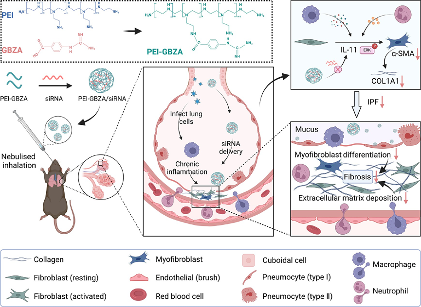许多临床研究表明,IPF与白细胞介素11IL-11)之间有着显著的相关性。以IL-11为靶点的治疗策略为IPF的治疗提供了希望。基于前期的研究基础,方华攀副教授、杨洋教授等人创新性地开发了一种可吸入小干扰RNAsiRNA)载体PEI-GBZAPEI-GBZA能够通过静电和氢键等多重作用有效地封装siRNA。通过吸入法,这种siRNA递送系统可以有效地将PEI-GBZA/siIL-11纳米颗粒保留在肺组织中,并且在博来霉素诱导的肺纤维化模型中,对多个关键病理过程(如成纤维细胞的迁移与分化、细胞外基质的沉积、炎性因子的释放,以及免疫细胞(中性粒细胞和巨噬细胞)的募集与激活)表现出显著的抑制作用。这种靶向干预策略不仅有效阻止了疾病的进展,还显示出良好的体内安全性。该治疗策略将为多种呼吸系统疾病的治疗提供有益的参考。