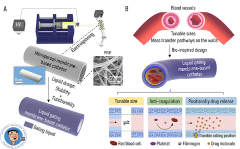 海洋之神8590cn官网侯旭教授课题组设计开发了一种液体门控医用导管,相关工作以“Bioinspired liquid gating membrane-based catheter with anticoagulation and positionally drug release properties”为题发表在Science Advances 2020, 6 : eabb4700。