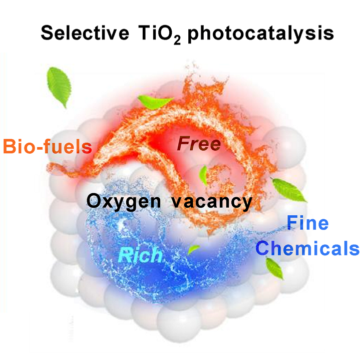 王野教授课题组最近研究发现,廉价、稳定且环境友好的TiO2半导体可高效催化多种木质纤维素平台分子的可控还原转化。光催化还原产物选择性强烈依赖于TiO2的暴露晶面。主要暴露锐钛矿{001}晶面的TiO2对加氢反应有高选择性,加氢产物的选择性均大于75%。而主要暴露金红石{110}晶面的TiO2则可高效催化偶联反应,偶联产物选择性高于80%。进一步与程俊教授课题组合作,对反应机理开展了深入研究。理论与实验研究共同揭示,不同晶面反应过程中原位生成的氧空位浓度差异是决定反应选择性的关键。氧空位可通过与表面反应物之间的相互作用,改变反应物及中间体的分子内电荷分布和吸附能,进而调控产物选择性。