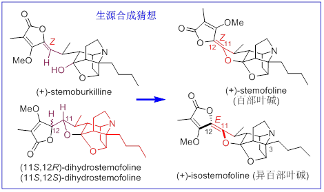 在研究中,课题组发现百部叶碱stemoburkilline、(11S,12R)-dihydrostemofoline和stemofoline由同一株植物中分离提取得到,由此提出了stemofoline可能由stemoburkilline转化而来的生源合成猜想。基于该猜想,设计合成路线并历经19步完成了四个百部叶碱类天然产物的全合成。该合成路线的关键步骤是:1)通过黄培强课题组发展酰胺活化反应构筑托品酮结构;2)铜催化的偶联反应合成氮杂季碳;3)HWE反应合成特窗酸酯片段,经16步完成了天然产物stemoburkilline和(11S,12R)-dihydrostemofoline;4)实现从天然产物stemoburkilline、(11S,12R)-dihydrostemofoline到stemofoline、 isostemofoline 的转化,验证了所提出的生源合成假说。