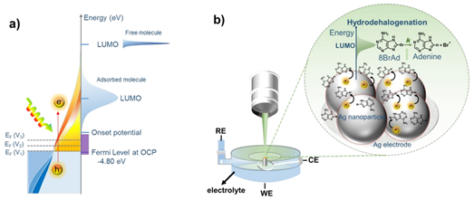 该工作利用8-溴腺嘌呤(8BrAd)分子作为热电子诱导脱溴反应的探针分子,在纳米银颗粒修饰的银电极(Ag NPs @ Ag)表面,利用时间序列的电化学表面增强拉曼光谱(EC-SERS)得到时间序列的原位反应过程,并建立基于EC-SERS动力学模型测定表观速率常数的方法。详细地研究了电极电位、激光波长和功率对PMCR动力学的影响。研究发现,对于吸附的8BrAd分子,当调控入射激光的能量和电极电位与吸附分子的最低未占用分子轨道(LUMO)匹配时,热电子的量子利用效率可以从0.1%提高到0.9%。利用DFT理论计算得到了热电子转移产生的瞬态负离子激发态和基态的反应路径,对电化学调控的等离激元热电子诱导C-Br断裂过程有了更清晰的认识,为设计PMCR光电协同的反应提供了新的视角。