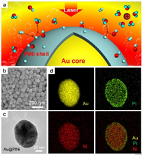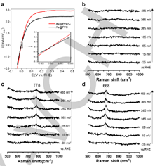 在该工作中,课题组合成了PtNi包金和纯Pt包金纳米催化剂。再利用原位电化学SERS和密度泛函理论(DFT)计算方法分别研究了PtNi合金和纯Pt表面的HOR过程。获得了HOR过程中,亲氧金属表面吸附的羟基(OHad)中间物种的直接光谱证据,并揭示了OHad在提高HOR性能的重要作用。